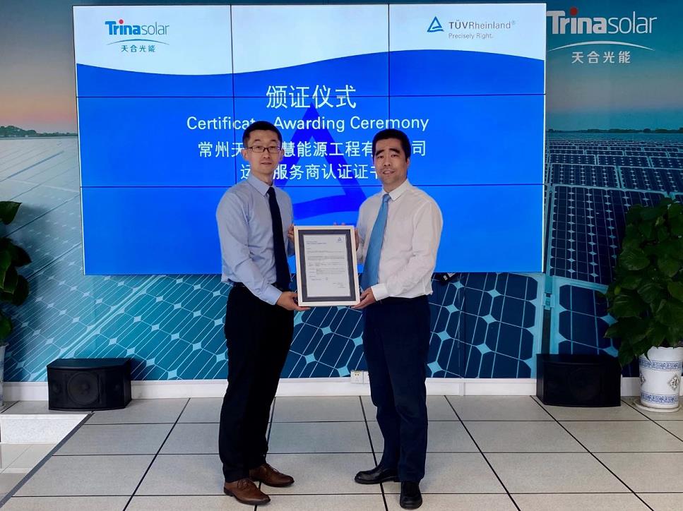 TÜV莱茵基于7大维度、30个评估项、100多个评估细项对天合智慧能源的运维能力和水平进行了全面的评估。在经过全面的严格评估后,向天合智慧能源颁发了运维服务商认证证书。