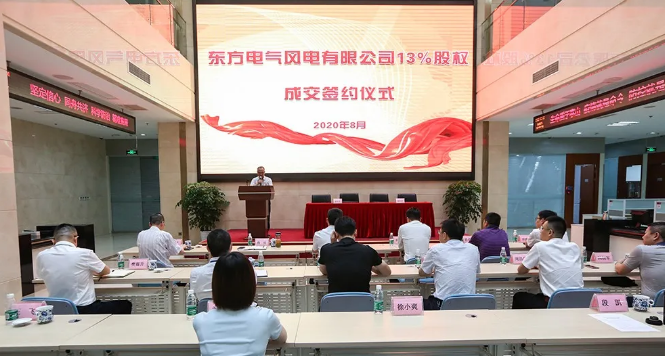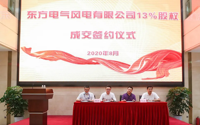 8月5日上午,东方电气风电有限公司13%股权转让签约仪式在四川成都隆重举行,转让方东方电气集团东方汽轮机有限公司党委常委、纪委书记廖华荣,受让方北京航天亚能安全技术有限公司董事长陈洲、重庆奕健轩科技合伙企业董事长陈奕光、山东龙马风能装备有限公司执行董事邓建双,标的企业东方电气风电有限公司副总经理詹明出席签约仪式。