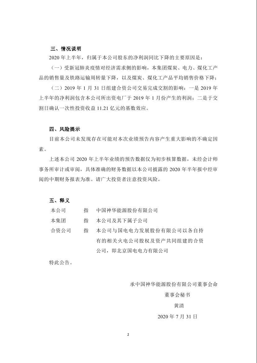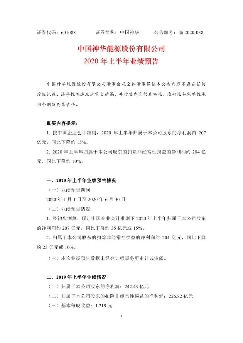 中国神华近日发布2020年上半年业绩预告,公告显示,2020年上半年归属于本公司股东的净利润约207亿元,同比下降约15%。2020年上半年归属于本公司股东的扣除非经常性损益的净利润约204亿元,同比下降约10%。