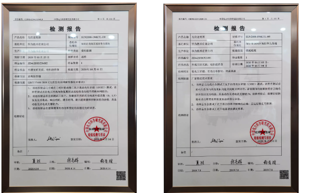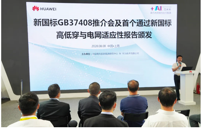 2020年8月8日,在SNEC上,中国电科院南京分院向华为颁发了首个通过新国标电网适应性报告证书,这是自2019年国内正式执行新国标(GB/T 37408 《光伏发电站并网逆变器技术要求》)实施检测认证以来的首次颁证,华为智能组串逆变器成为行业内首款通过新国标考核的光伏逆变器,担纲业界逆变器质量和并网性能技术新标杆。