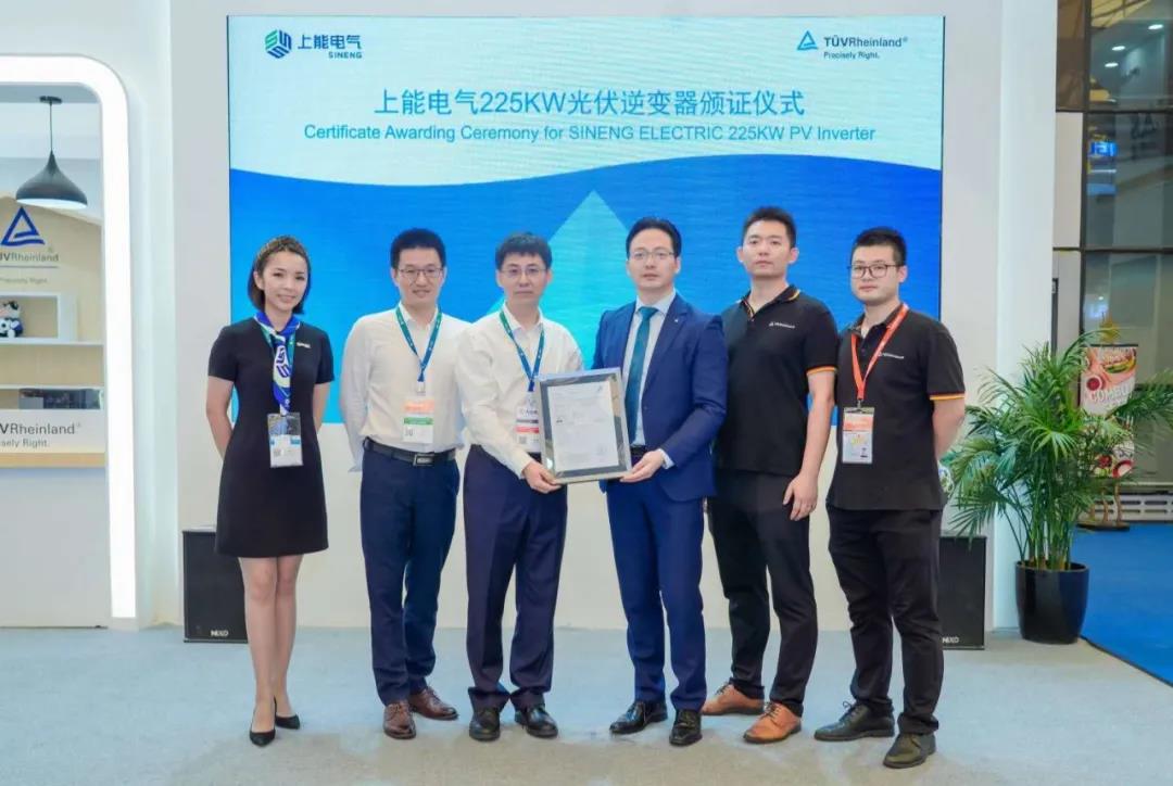 同期,全球领先的第三方检测认证机构TUV莱茵为上能电气热销型号SP-136K-H及最新型号SP-225K-H逆变器颁发TUV证书。TUV莱茵大中华区光伏与电子电气总经理李卫春与上能电气副总裁、首席技术官李建飞共同出席了颁证仪式。