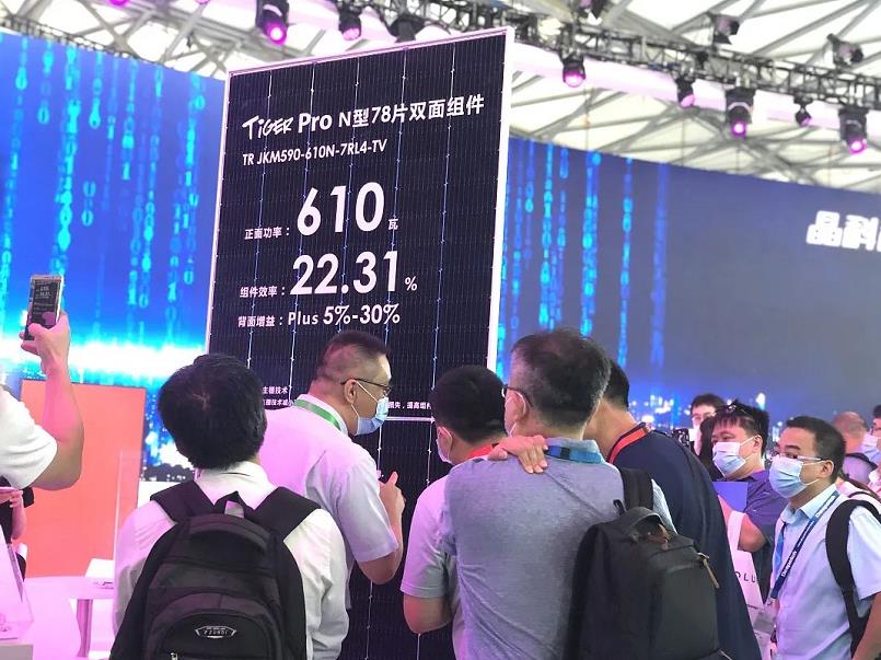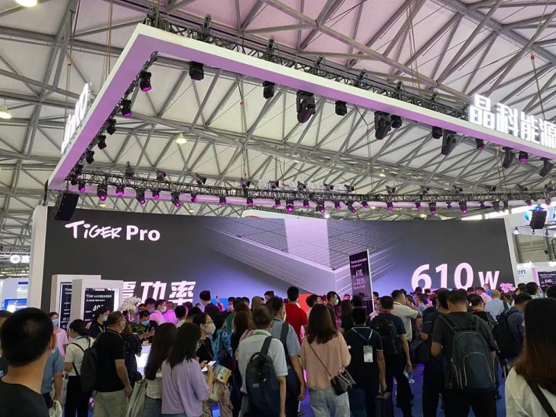 本次SNEC展上,晶科能源现场发布新一代高功率Tiger Pro系列610W组件,该产品不仅搭载了M10尺寸的HOT 2.0 N型电池,更是行业内首次实现大尺寸和高效N型技术的结合,最高功率输出达到610W,最高效率22.3%,实现了功率和效率的双重突破。