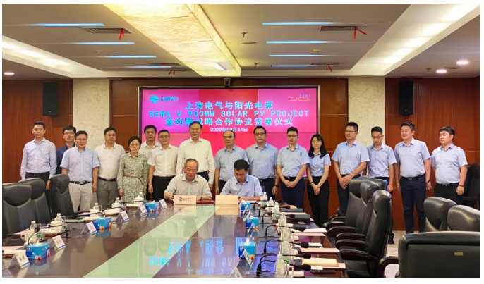 8月14日,上海电气与阳光电源在上海正式签署全面战略合作协议,就光伏、储能项目展开深度合作,在全球范围内共同打造更具商业价值和更高品质的光伏电站。会上,双方还签署了迪拜DEWA太阳能园区第五期900MW光伏项目采购协议。