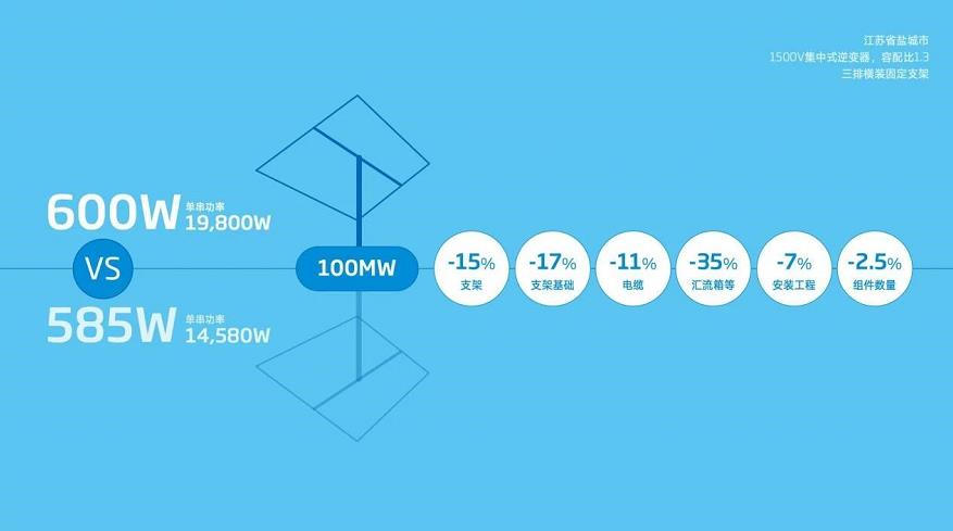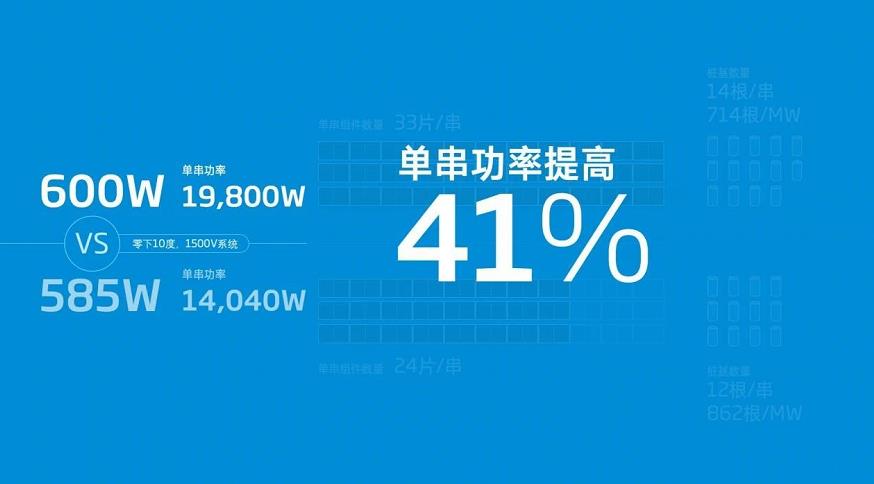 以600W至尊组件为例,典型条件下,每串可安装33块组件;对比585W其他品牌产品,单串功率提升约41%,可减少15%支架用量,17%支架基础用量及35%汇流箱数量,同时可节约11%线缆用量和7%的施工成本,最终可降低每瓦1毛钱的BOS成本。