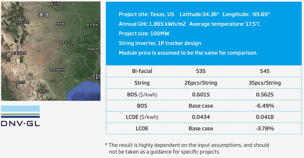 同时,经第三方机构DNV.GL模拟测算,基于美国得克萨斯州大型地面跟踪项目,采用组串式逆变器1P安装方式,天合至尊545W组件较其他品牌535W组件可以节省BOS 6.49%,降低LCOE 3.78%。