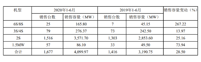 报告期内,公司风力发电机组及零部件销售收入为人民币1,456,563.72万元,同比上升25.14%;2020年1-6月实现对外销售机组容量4099.97MW,同比上升28.50%。