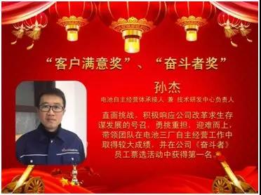 电池自主经营体承接人兼技术研发中心负责人孙杰获得“客户满意奖”和“奋斗者奖”