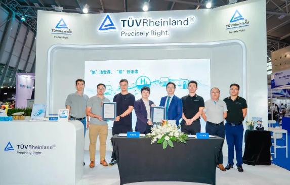 作为现场的重要活动,德国莱茵TÜV在展会现场为铧德氢能颁发了一系列认证证书,旨在为铧德氢能的产品出口到欧美等高端市场做好质量把关,解决企业登陆海外市场的准入问题和采信问题,助力铧德氢能在新能源及能源管理行业激烈的市场竞争中乘风破浪。