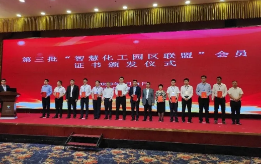 届大会上,包括南大环保在内的10家单位加入智慧化工园区联盟,吕振华总经理代表公司上台领取联盟成员证书并合影留念。随后,吕总作为专家评委参加了全国十家化工园区创建示范工作的总体评估。