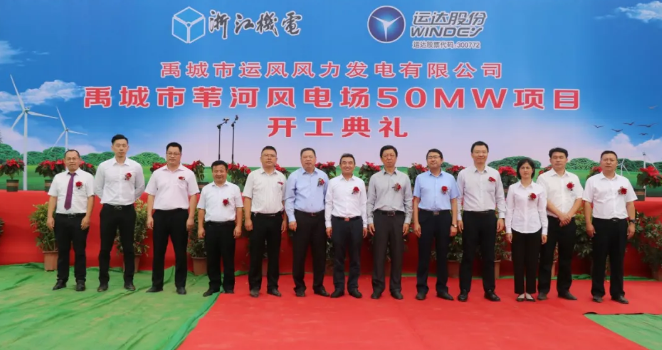 9 月 23 日,运达股份山东禹城市苇河风电场 50MW 风电项目开工仪式在山东省禹城市莒镇隆重举行。德州市发改委副主任程木文,禹城市市委常委、常务副市长王建国,禹城市发改局局长杨晓辉,禹城市莒镇党委书记李晓、莒镇党委副书记宁传民、辛寨镇党委书记王立彬,浙江省机电集团有限公司副总经理楼国庆、浙江运达风电股份有限公司副总经理斯建龙,中国电建集团核电工程有限公司董事长刘法书、办公室主任邢金超,中国电建集团核电工程有限公司新能源分公司总经理蔡国军,山东广大工程咨询有限公司总经理刘宏业等嘉宾出席了项目开工仪式并为项目奠基。开工仪式由禹城市运风风力发电有限公司总经理陈敏主持。