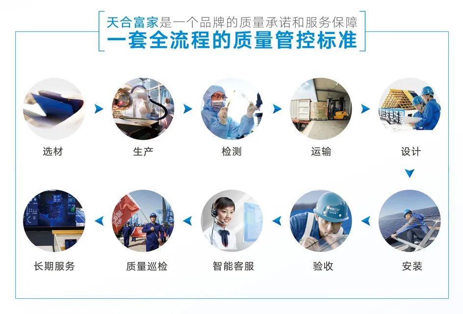 天合富家是天合光能旗下原装户用光伏系统品牌,自2016年成立之初,就在行业内首创“原装”理念并制定原装4T标准,即“优质的原装硬件、专业的原装设计、可靠的原装交付、完善的原装售后”。天合富家始终以用户利益为导向,围绕品牌、产品、服务三大核心战略建立了以产品研发、市场销售、安装售后、智能运维为一体的完整体系,构建了数字化、全渠道的生态网络;通过涵盖选材、生产、检测、仓储、运输、设计、安装、验收、并网、验收十个环节的全过程的质量闭环管理体系,切实保障用户和业主的合法权益。