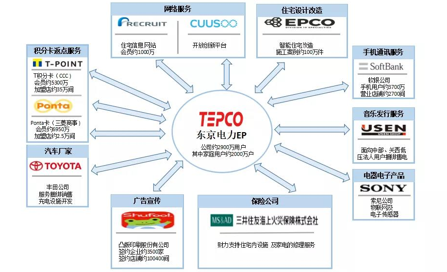 东京电力积极联合设计、电子电器、信息技术、汽车、通讯、保险等行业的服务商,采用“个性化电费方案+企业联盟营销+客户需求响应+增值服务扩展”的营销策略,推出了用能监控、节能降耗、智慧家庭、电动汽车充电、精准广告投递等套餐服务,全方位满足客户需求。