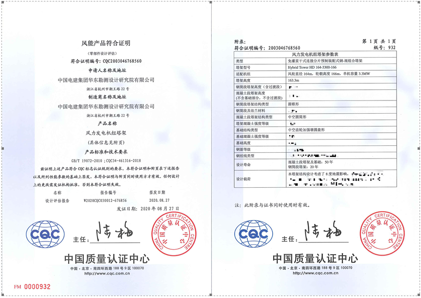 2020年8月,华东院166m免灌浆干式连接分片预制装配式钢-混组合塔架成功取得中国质量认证中心风能产品设计认证。