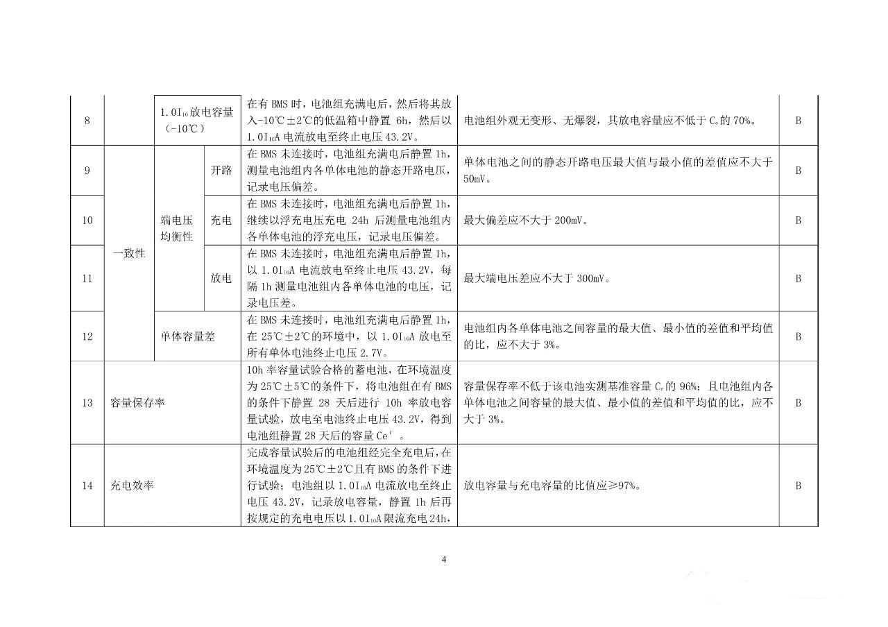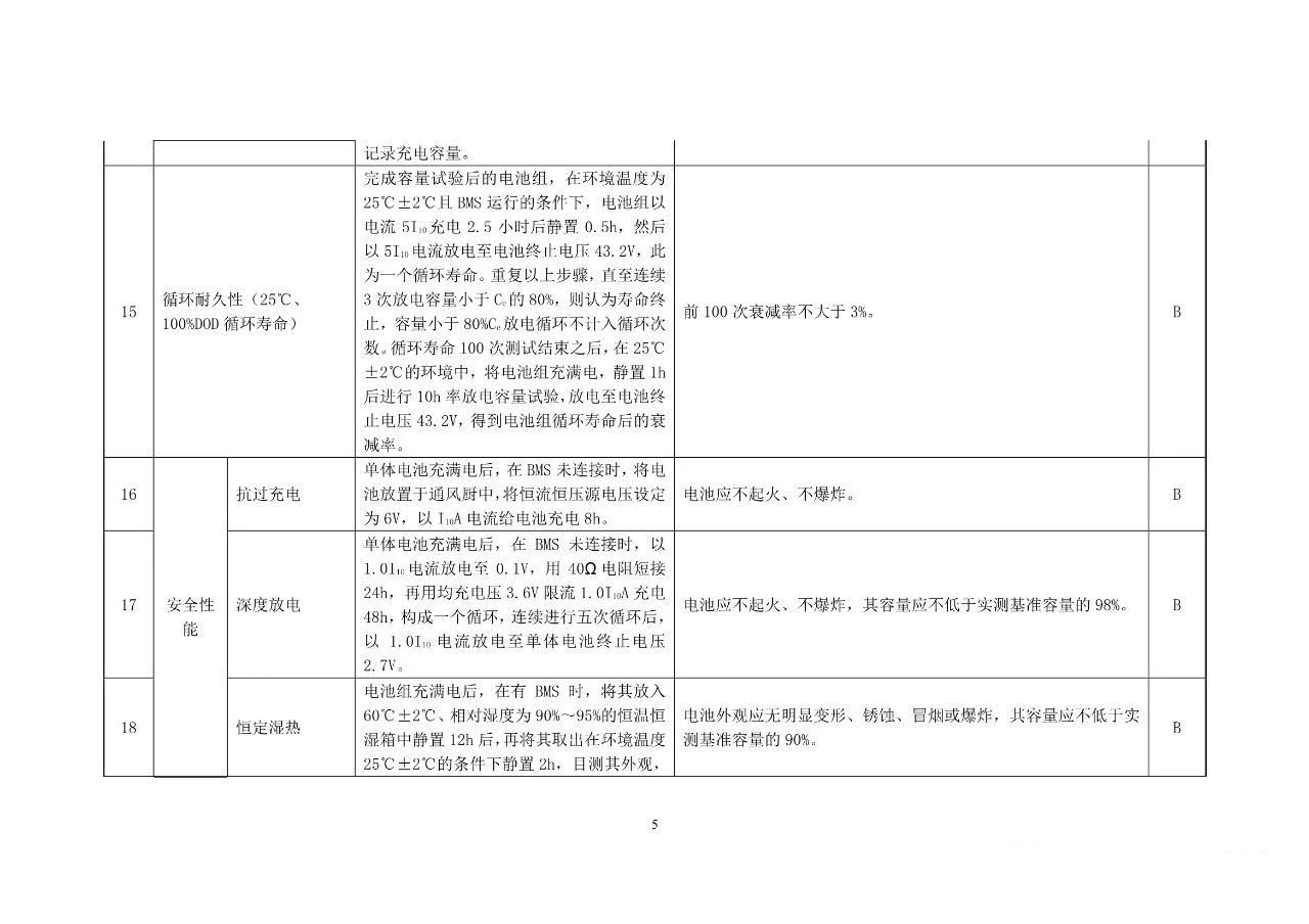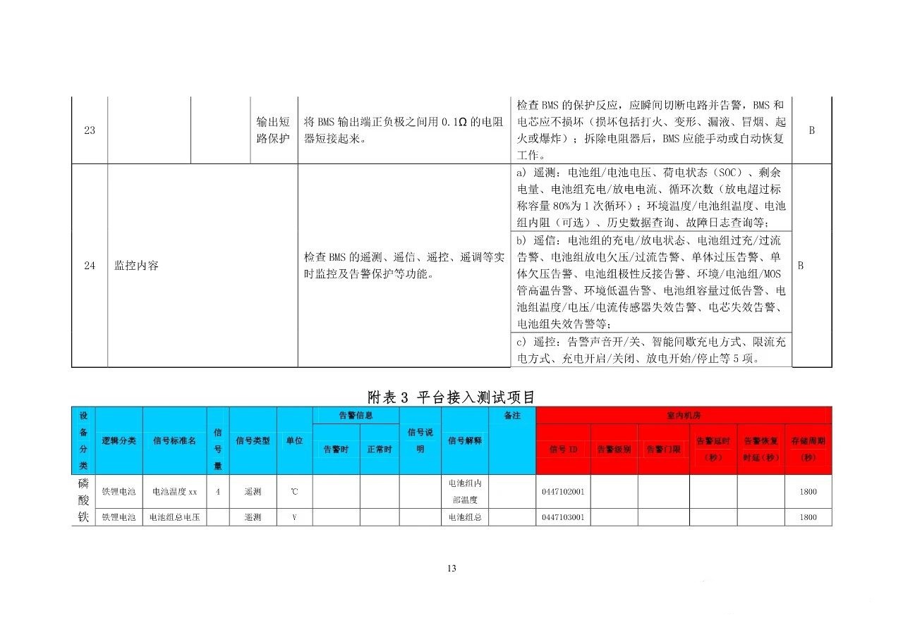 据近日中国铁塔和中国电信分别发布的备用磷酸铁锂电池常态化测试公告,要求送检供应商应为磷酸铁锂电池组产品的生产制造商,同时具备磷酸铁锂电芯自主生产能力,送样型号为磷酸铁锂电池组(集成式)备电48V/100Ah,《磷酸铁锂电池检测实施细则》要求送样5组电池组、1个BMS和9个单体电池,备电用磷酸铁锂电池的检测分为系统、BMS和平台接入三部分,在安全性能方面要求电池在抗过充电、深度放电、抗冲击、抗高温、抗短路等条件下应不起火、不爆炸,详细要求见附件。