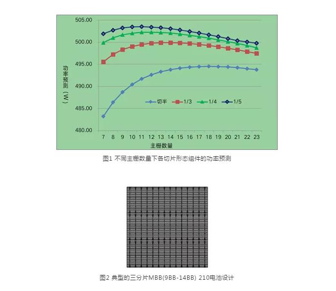 合博士:从功率和效率角度来看,基于行业主流的多主栅技术,天合光能研发团队针对不同主栅数量结合主流规格圆形焊带、不同分片数量进行功率模拟。其中50片210*210mmPERC单晶电池,按PERC电池2020年底的预测效率进行测算。通过下方的预测可以发现,二分片切半方案由于串阻提升,限制了210的输出功率;四分片和五分片的功率相对三分片略有提升,但随着分片数量的增加,组件相关制程难度将随之大大提高,同时对产品良率将产生较大影响。而三分片采用9BB~14BB的设计组件功率差异在2W之内,典型的电池设计如下图2所示。