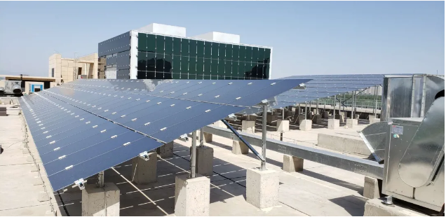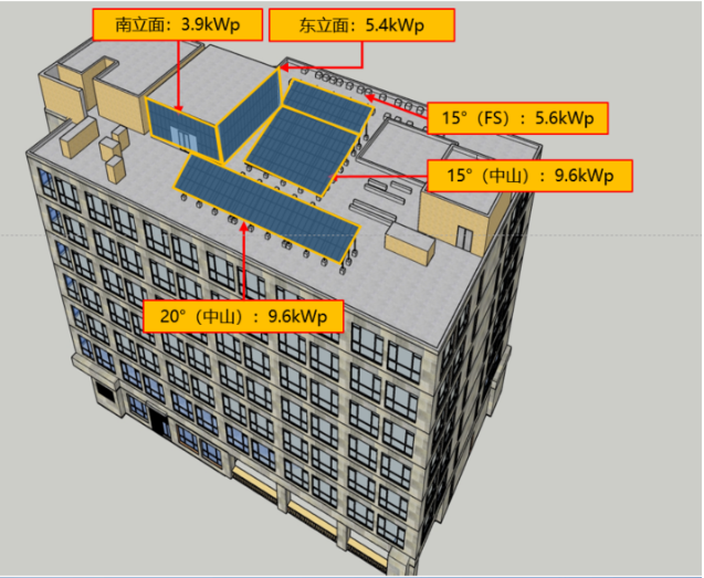项目采用碲化鎘光伏发电技术,碲化鎘薄膜具有发电能力强、弱光效应好、稳定性高等特点,设计了东立面、南立面、最佳倾角、15°倾角,不同厂家共5个光伏子单元来验证不同朝向、不同厂家产品的发电性能。同时,在东立面和南立面进行了建筑外立面应用效果的展示。