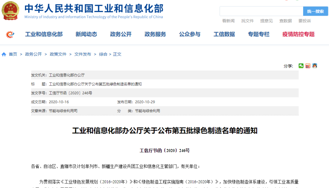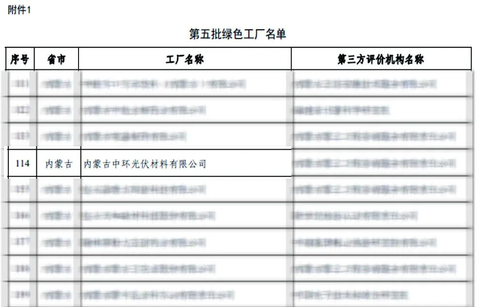近日,中华人民共和国工业和信息化部第五批绿色制造名单进行了公布。全国入选绿色工厂公示名单的企业共有719家,其中内蒙古企业共计24家,内蒙古中环光伏材料有限公司成功入选,公示相关内容如下: