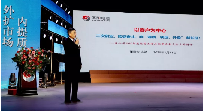 二次创业赋新能,适应新经济调转升。2019年,圣阳全员齐心协力,调经营质量、转型经营结构、升级经营平台,经营数量和经营质量均取得改善和提升。公司总裁宫国伟在会上做年度经营工作报告,报告铿锵有力、振奋人心。