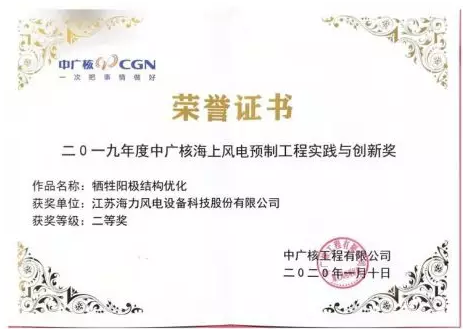 2020年1月10日,江苏海力风电设备科技股份有限公司(以下简称“海力风电”)在深圳市大鹏新区大亚湾核电基地AE楼召开的中广核海上风电预制工程2019-2020年度工作会议上荣获两个“二〇一九年度中广核海上风电预制工程实践与创新奖”,获奖作品分别为:牺牲阳极结构优化(二等奖)和中广核汕尾后湖单桩项目厚板卷制工艺(优秀奖)。