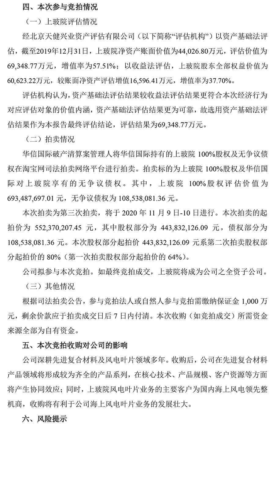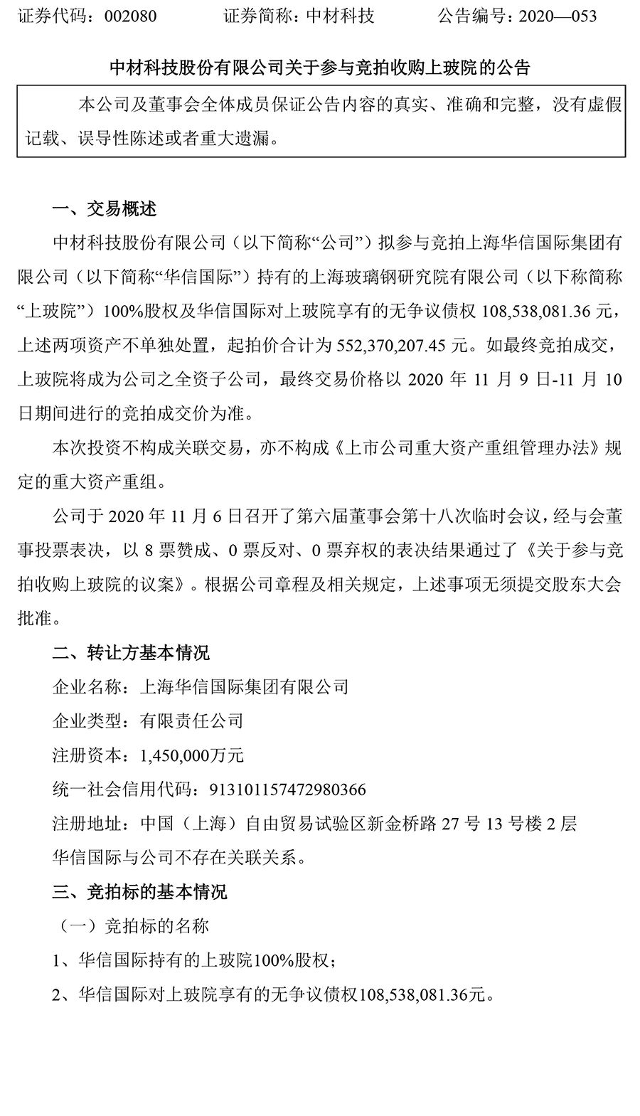 中材科技11月6日晚间发布公告,公司拟参与竞拍华信国际持有的上玻院100%股权及华信国际对上玻院享有的无争议债权1.09亿元,上述两项资产不单独处置,起拍价合计为5.52亿元。如最终竞拍成交,上玻院将成为公司之全资子公司,最终交易价格以11月9日-11月10日期间进行的竞拍成交价为准。