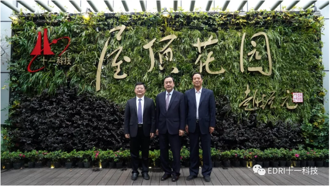 十一科技董事长赵振元,副董事长孙鸿伟、何平会在屋顶花园亲切合影