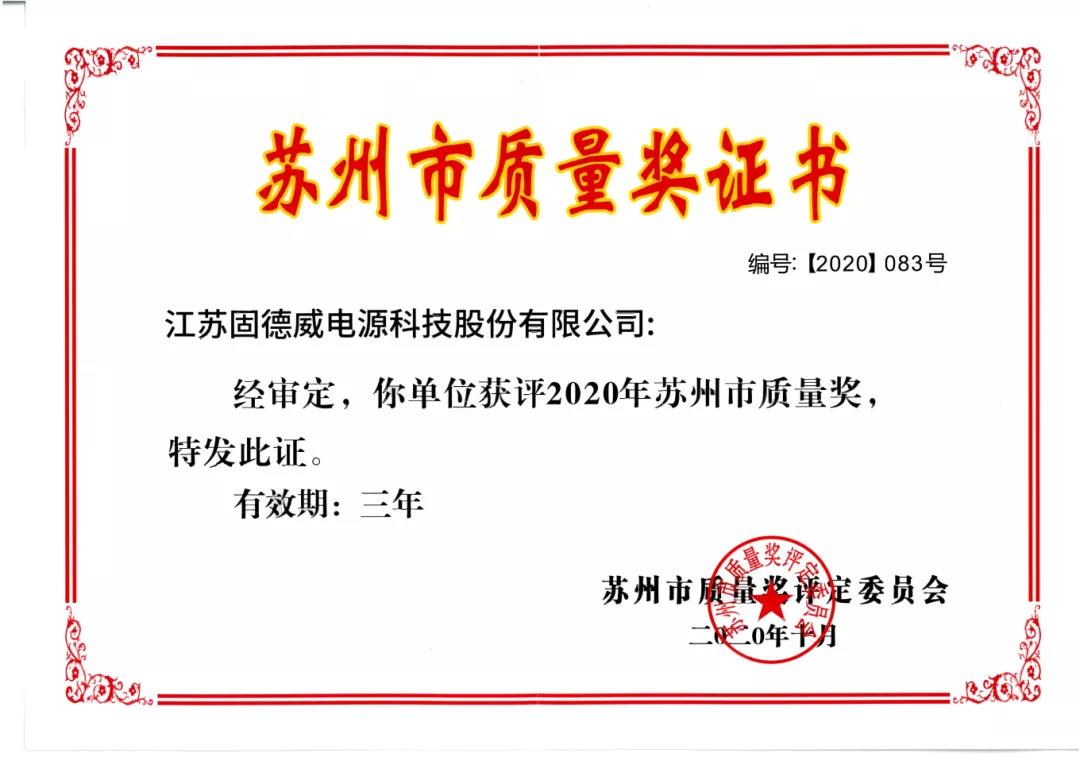 对于质量的追求,也让固德威脱颖而出。日前,苏州市质量奖评定委员会发出《关于公布2020年苏州市质量奖获奖组织的决定》,苏州市共87个组织被授予2020年苏州市质量奖荣誉称号,固德威荣幸在列,饱受嘉奖!