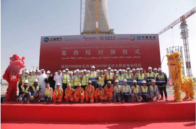 迪拜水电局(DEWA)、NOOR ENERGY 1、上海电气、中建三局二公司等相关负责人,及各参建相关单位嘉宾,共同出席封顶仪式,见证了这一历史性的时刻。