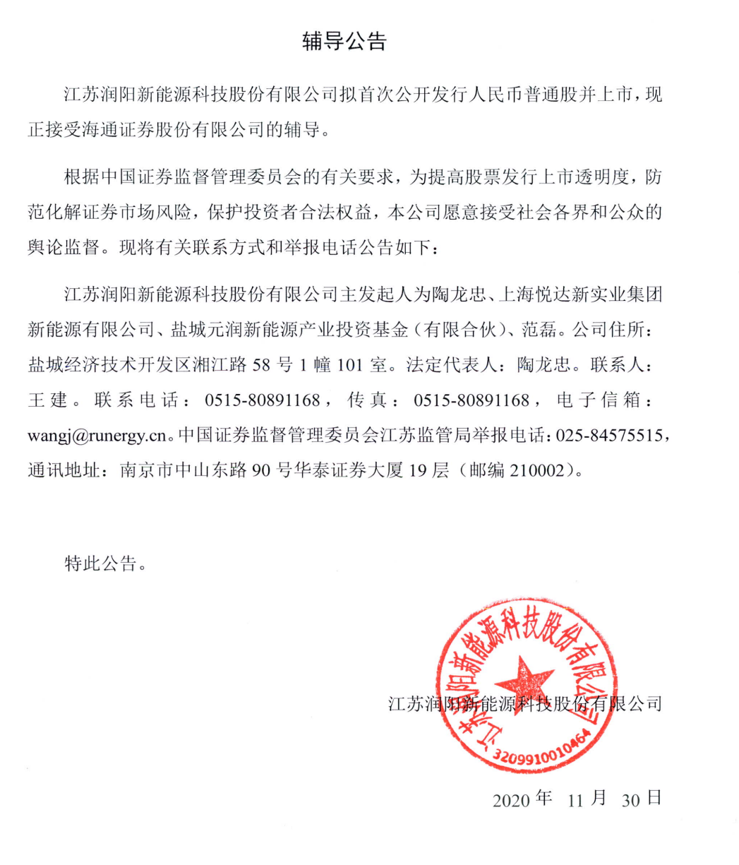 江苏润阳新能源科技股份有限公司首次公开发行股票并上市接受辅导公告