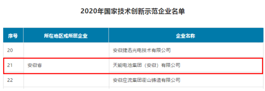 近日,工信部公布的《2020年国家技术创新示范企业名单》中,天能电池集团(安徽)有限公司(下称“天能界首公司”)榜上有名。此前 ,天能电池集团股份有限公司曾入选国家技术创新示范企业。