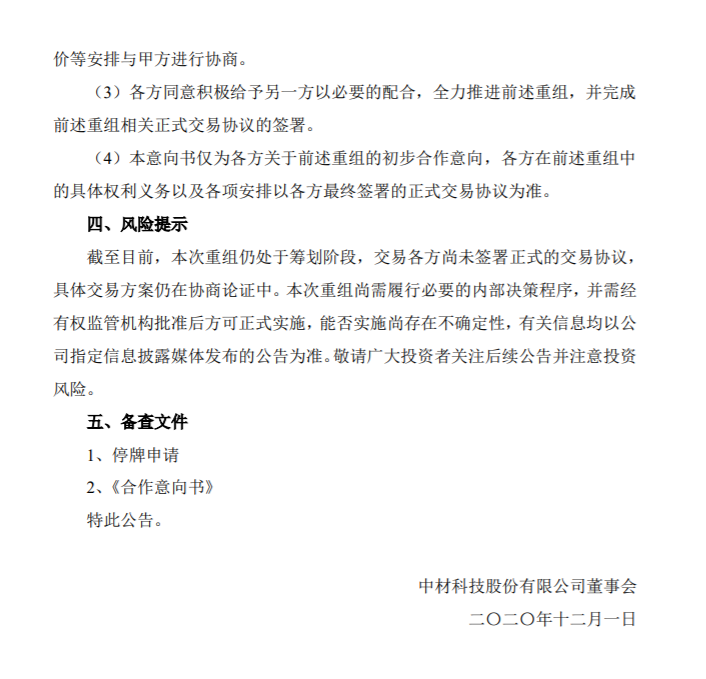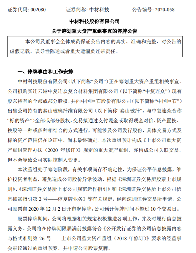 12月1日,中材科技股份有限公司(以下简称中材科技)发布《关于筹划重大资产重组事宜的停牌公告》。
