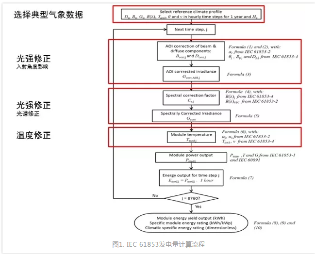 通过上面的比较分析,我们可以发现,发电量的影响因素是非常多的。只有充分考虑各个因素的影响,才能提高发电量分析的准确性。另外,除了PVSyst这样的专业软件可以用来做发电量计算外,已经有相应的国际标准IEC61853系列发布,指导行业对发电量进行更专业细致的分析,TÜV南德可以在这方面给客户提供协助和支持,下面是IEC 61853标准里的发电量计算流程图1。
