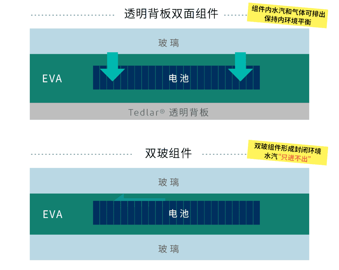 由于水汽会慢慢从边框和接线盒打孔处逐渐渗入组件,背板的可呼吸特性可以有效的将水汽和封装材料降解产生的物质通过背板释放出来,避免组件脱层和电池片腐蚀。