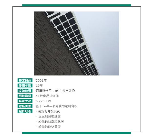 可靠耐久一直是Tedlar® 引以为傲的性能,Tedlar® 透明背板同样保持了光伏行业时间最长的应用记录。2001年荷兰阿姆斯特丹的BIPV项目上已使用了Tedlar® 透明背板,历经愈19年户外考验,性能依然保持良好,无任何缺陷。
