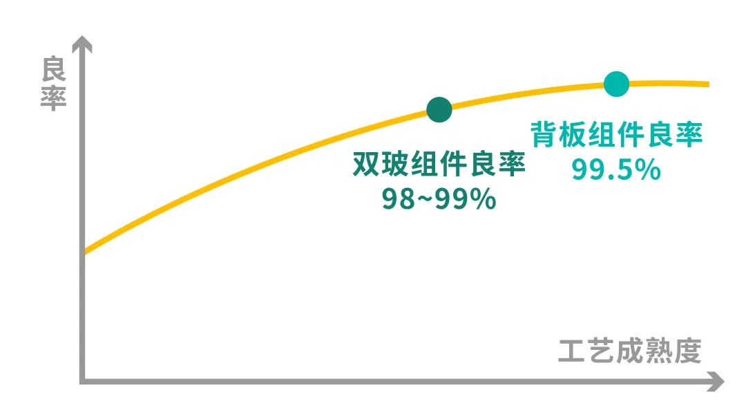 Tedlar® 透明背板双面组件完全兼容传统单玻单面组件工艺,组件制造良率较双玻组件高0.5%-1.5%。由于减薄的半钢化玻璃易爆裂,层压过程中升降温速度需要减慢,加上双玻组件层压时排气慢,生产双玻组件的层压速度较单玻组件慢10%-20%,采用Tedlar®透明背板方案,组件制造效率明显高于双玻组件。