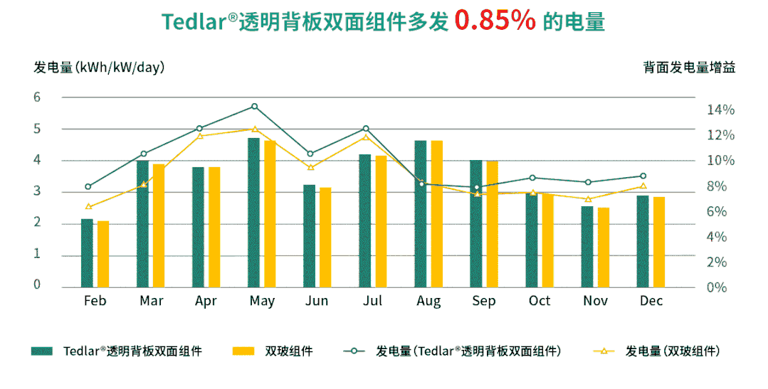 采用Tedlar®透明背板的双面组件在发电量方面独具优势,从数家组件制造商、电站业主的统计数据来看,在同等安装条件下,Tedlar®透明背板双面组件的发电量较双面双玻组件高0.8%~1.8%。权威第三方机构PVEL发布的测试结果中,透明背板双面组件运行温度较双玻组件低,Tedlar®透明背板良好的散热性能使得双面组件发电效率更高。
