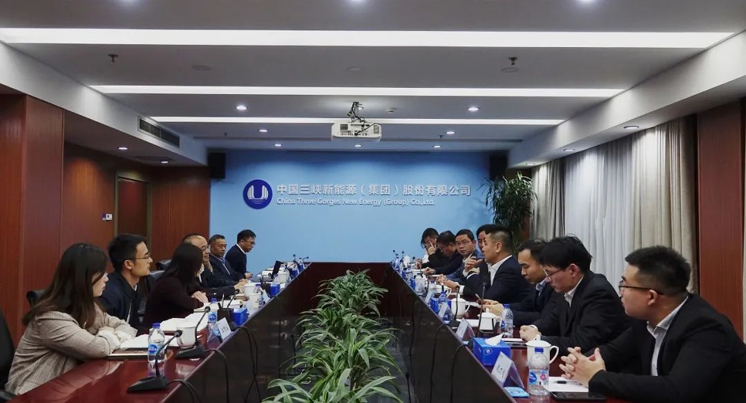 签约仪式前,三峡新能源党委副书记、总经理赵国庆与正泰集团轮值总裁栾广富一行进行座谈。
