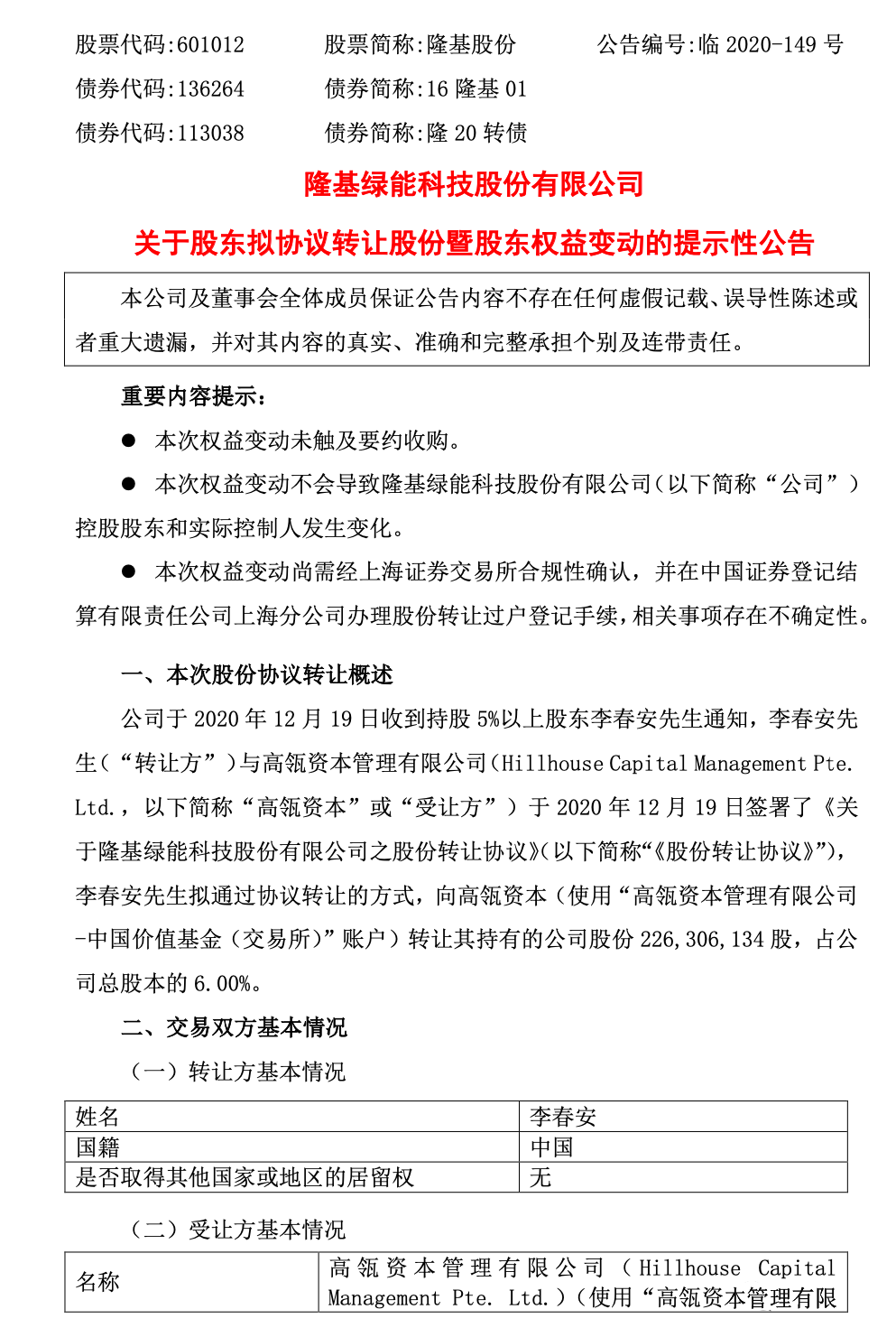 2020年12月20日,隆基股份发布公告《关于股东拟协议转让股份暨股东权益变动的提示性公告》(全文附后),李春安与高瓴资本签署股份转让协议: