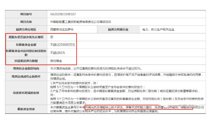 中船重工拟面向电力、热力生产供应企业募资25亿元对中船重工新能源公司进行增资,本次增资完成后,公开征集到的意向投资方的持股比例合计不超过81%。募集资金主要用于未来开展光热及储能核心技术研发、投资建设光热电站、储能项目等。信息披露时间自2020年12月21日起至2021年2月20日止。