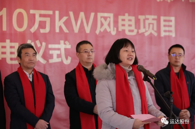 运达股份党委书记、总经理高玲向出席仪式的领导、来宾表示热烈欢迎。她表示,张北二台镇宇宙营10万kW风电项目是运达股份与战略合作伙伴——中节能风电共谋发展的成果体现。在抢装潮带来的设备供应压力下、在新冠疫情期间全国性停工停产难题下,该项目得到了各级政府、领导及合作单位的大力支持,全体参建人员牢固树立“一盘棋”思想,以打造精品工程为目标,将准备到位、组织到位、措施到位、协调到位融入工程各个环节,积极探索项目建设运营的宝贵经验。