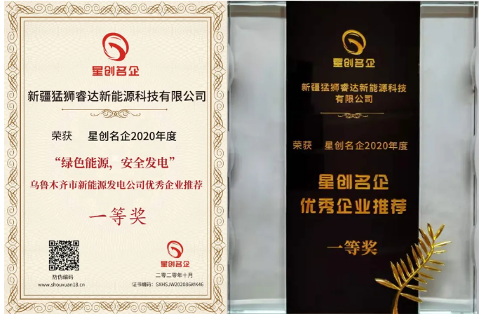 11月17日,新疆猛狮睿达荣获乌鲁木齐市新能源发电公司优秀企业推荐一等奖