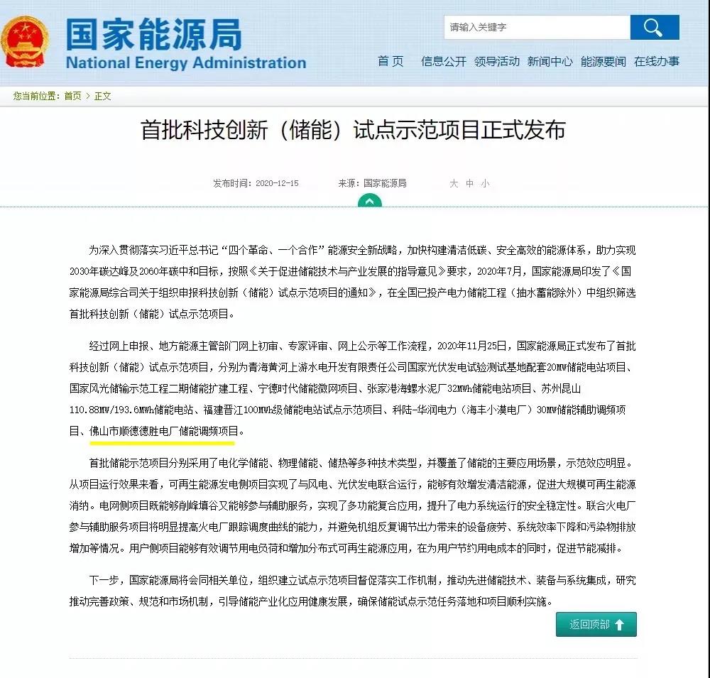 2020年,智光佛山市顺德德胜电厂储能调频项目入选“国家能源局首批科技创新(储能)试点示范项目”,智光级联型高压储能技术被市场认可,多个项目陆续投运。