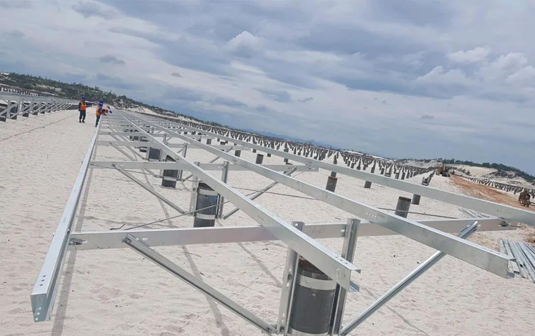 该项目位于越南中北沿海地区的广平省,占地50公顷,场区内日均太阳辐射量约为4.5kWh/㎡,年平均日照时间达到2550-2700小时,富饶的光照条件极为适合光伏电站的投资建设。但由于广平省临近海洋,不仅常年高温多雨,年均湿度较高,而且空气盐分含量高,对项目所需光伏支架防腐性能提出极高要求。华鼎太阳能技术团队经过研究讨论,决定通过增大镀锌层,优化系统结构,简化安装步骤等方式为其专门定制光伏支架,使其很好地适应项目地高湿度环境和便捷安装的使用要求。
