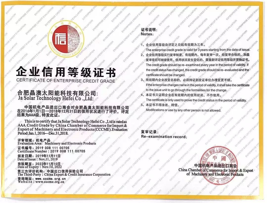 2019年11月,晶澳太阳能有限公司获中国机电产品进出口商会企业信用最高评级 AAA 级。晶澳合肥基地同批次获企业信用评级 AAA 级。