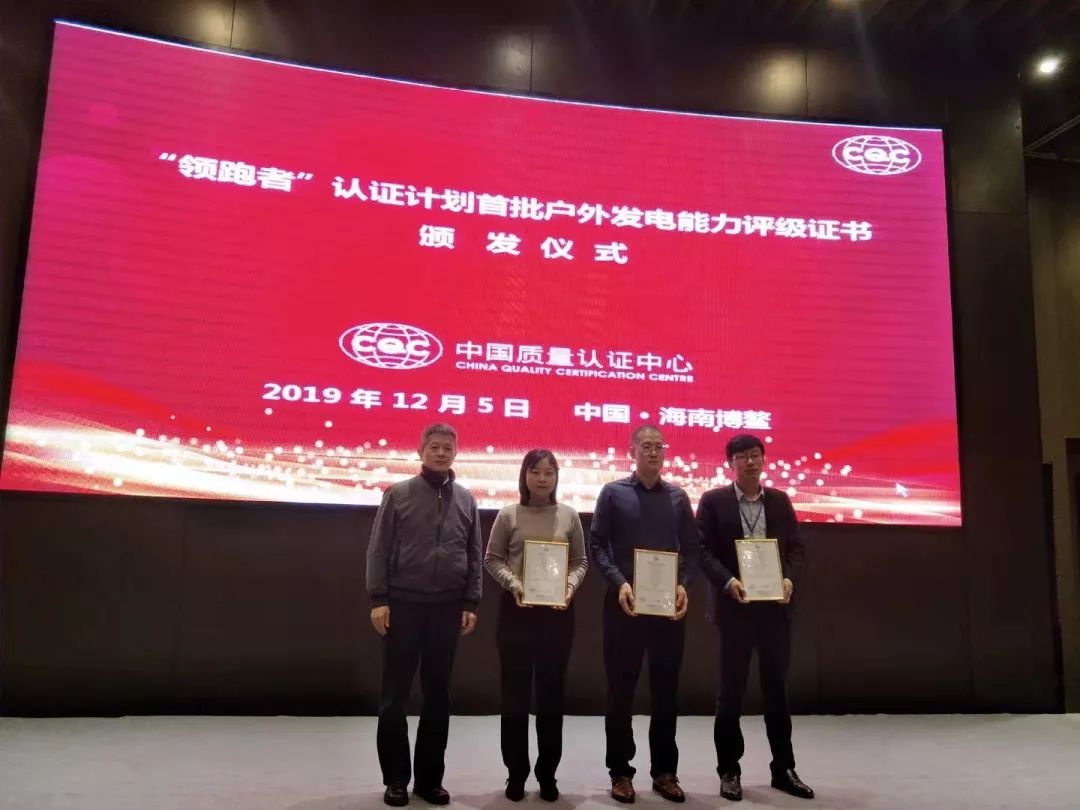 2019年12月5日,由中国质量认证中心(CQC)和中国电器科学研究院联合主办的光伏产品环境适应性及户外发电能力评级研讨会在海南博鳌召开,晶澳获得“领跑者”认证计划首批户外发电能力一级证书。