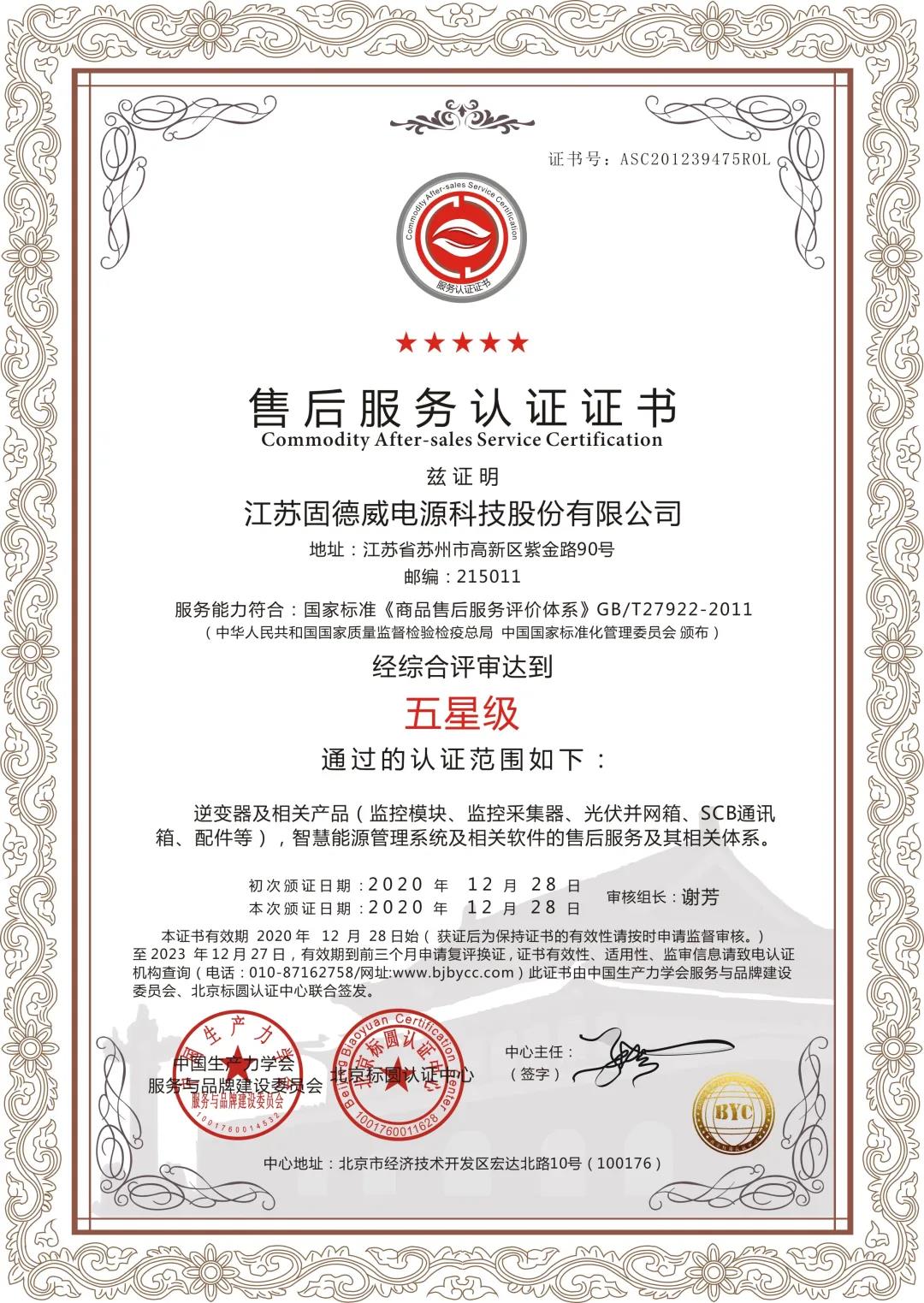 近日,经第三方认证中心专家严格审核,全国商品售后服务评价达标认证评审委员会评定,江苏固德威电源科技股份有限公司的售后服务能力达到五星级最高标准,这一标准符合国家GB/T27922-2011《商品售后服务评价体系》。