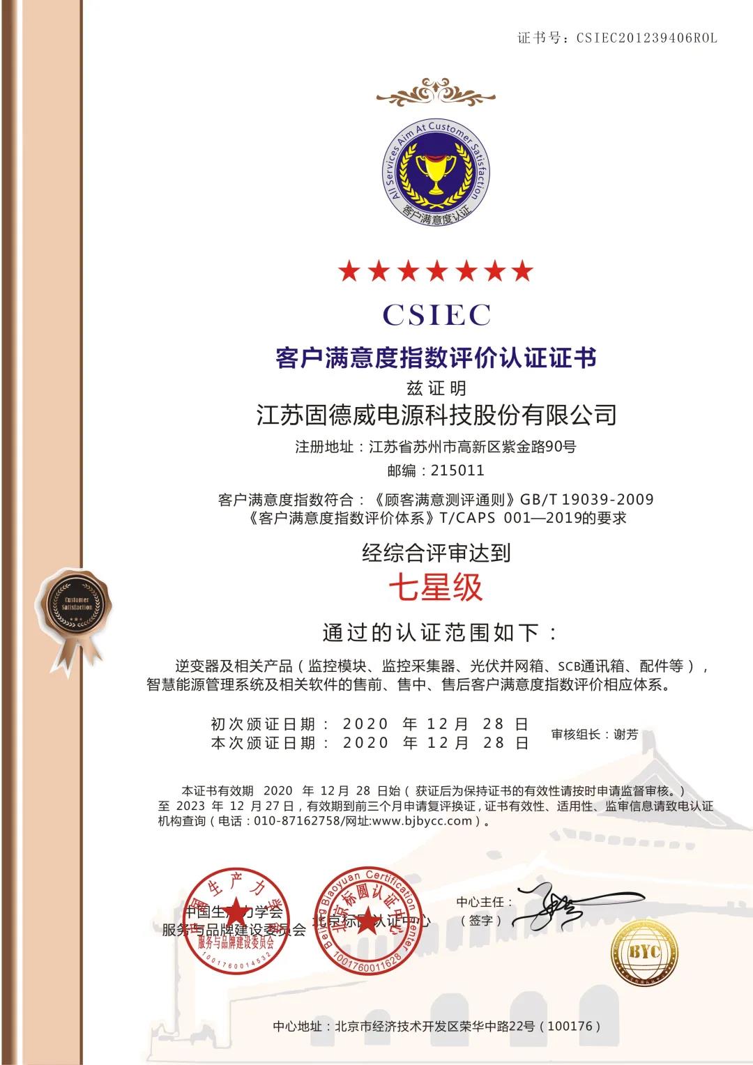 同时,基于对“客户满意度”的重视,固德威还一次性通过了客户满意度指数评价体系七星级权威认证,在《客户满意测评通则GB/T19039-2009》和《客户满意度指数评价体系T/CAPS001-2019》双标准下,固德威的品牌形象、预期质量、感知质量、感知价值、客户满意、客户投诉、客户忠诚等方面得到全面认可。