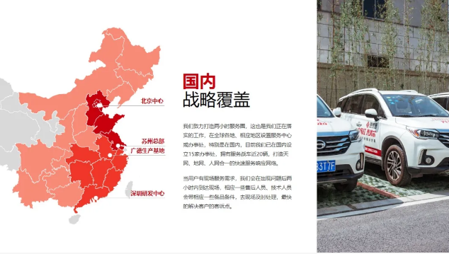 在国内,固德威拥有15家直属办事处和30+授权服务网点,建立起覆盖全国的售后服务体系网络,每个网点都会配备“固德威服务战车”,专业技术工程师常年驻点,精准上门,构建3小时售后服务圈,极速响应客户需求,减少故障引起的发电损失。同时,结合线上呼叫中心专业服务,365天全年无休,给您最贴心的服务保障。