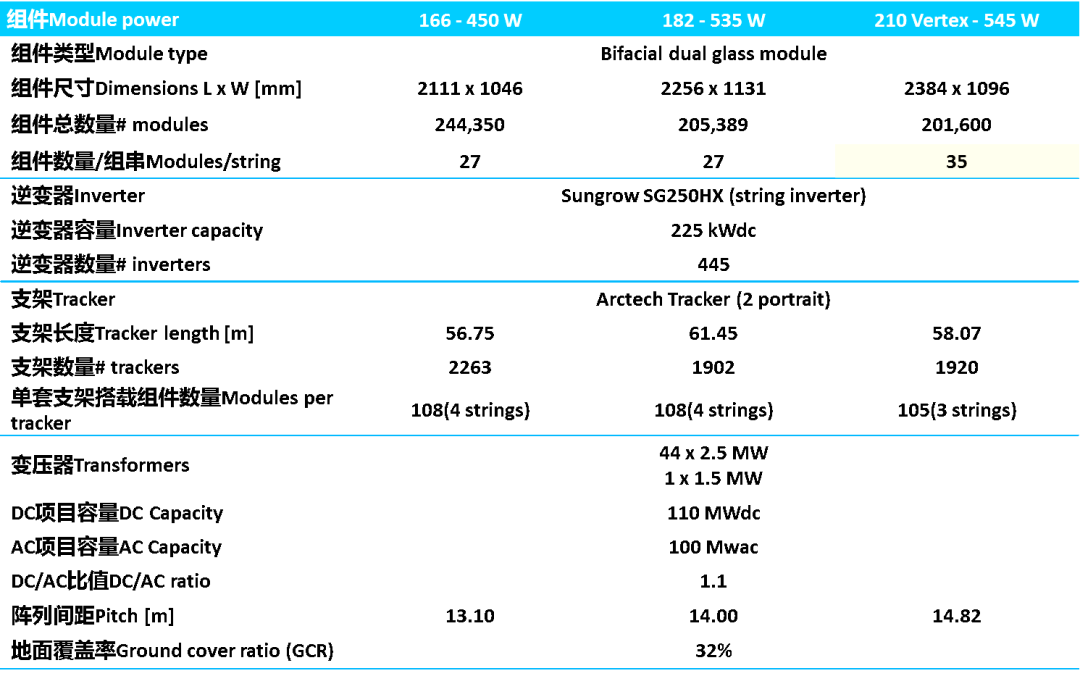 以上述两个地点作为测算项目地,DNV GL分别测算210至尊系列双面双玻545W组件在双排竖装2P跟踪支架系统下,对比166mm 双面双玻450W组件及182mm双面双玻535W组件的系统成本BOS及度电成本LCOE。测算项目固定为100MW AC容量,相同DC/AC 比值设计电站,使用主流双排竖装平单轴(2P)跟踪支架,配套主流组串式逆变器。系统设计中固定地面覆盖率(GCR,Ground cover ratio),保证双面组件的双面应用阴影遮挡影响的一致性。