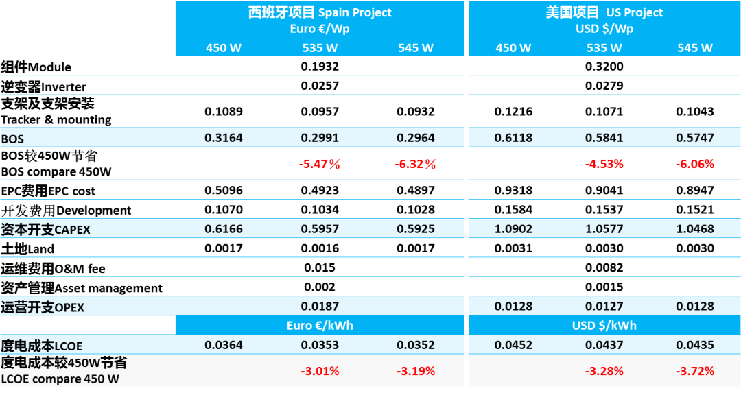 上述设计旨在控制同地点外部因素影响、系统配置,客观对比测算不同类型组件对于系统造价及度电成本的差异影响。在测算中针对两个项目地址,三种组件的成本对比都采用了当地设备、建安、人工造价、上网电价、运维成本、土地成本、财务成本等一致的条件,确保成本测算的完整及客观。