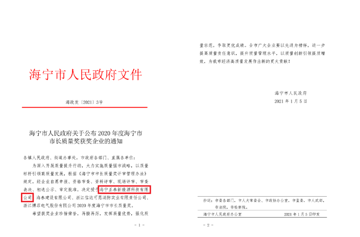 脱颖而出!海宁正泰新能源获“2020年度海宁市市长质量奖”